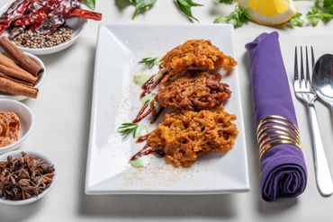 Thinly sliced onion marinated in aromatic spices and coated with chickpea batter cooked until golden brown