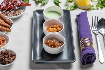 Condiments / Papadums / Raita / Mint Chutney / Tamrind chutney / Mixed pickle / Salads